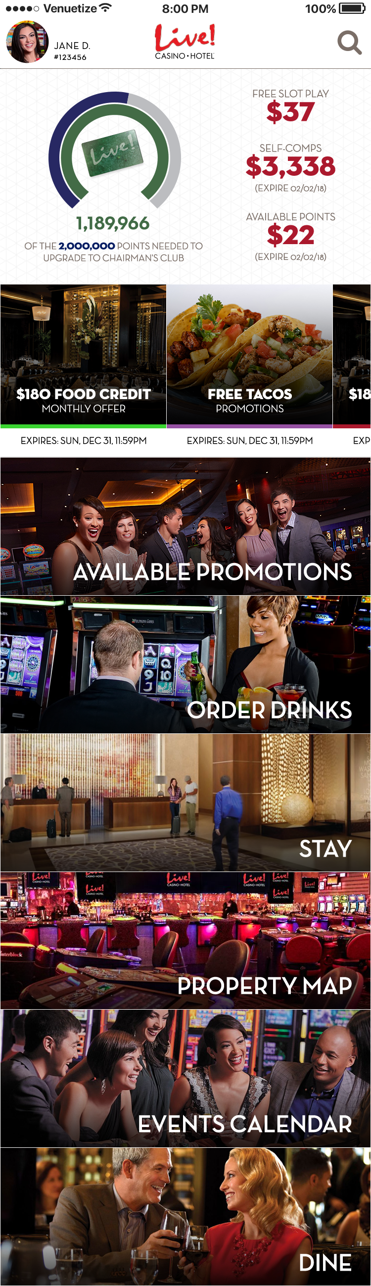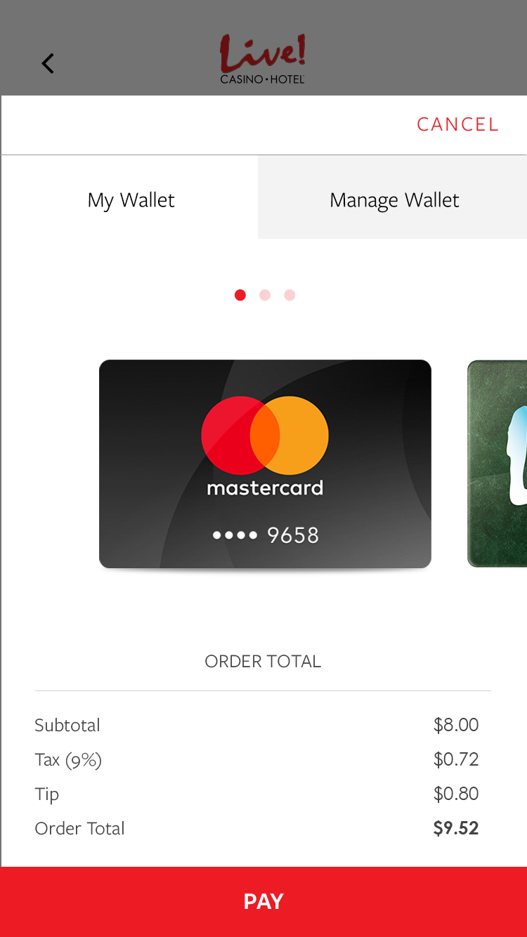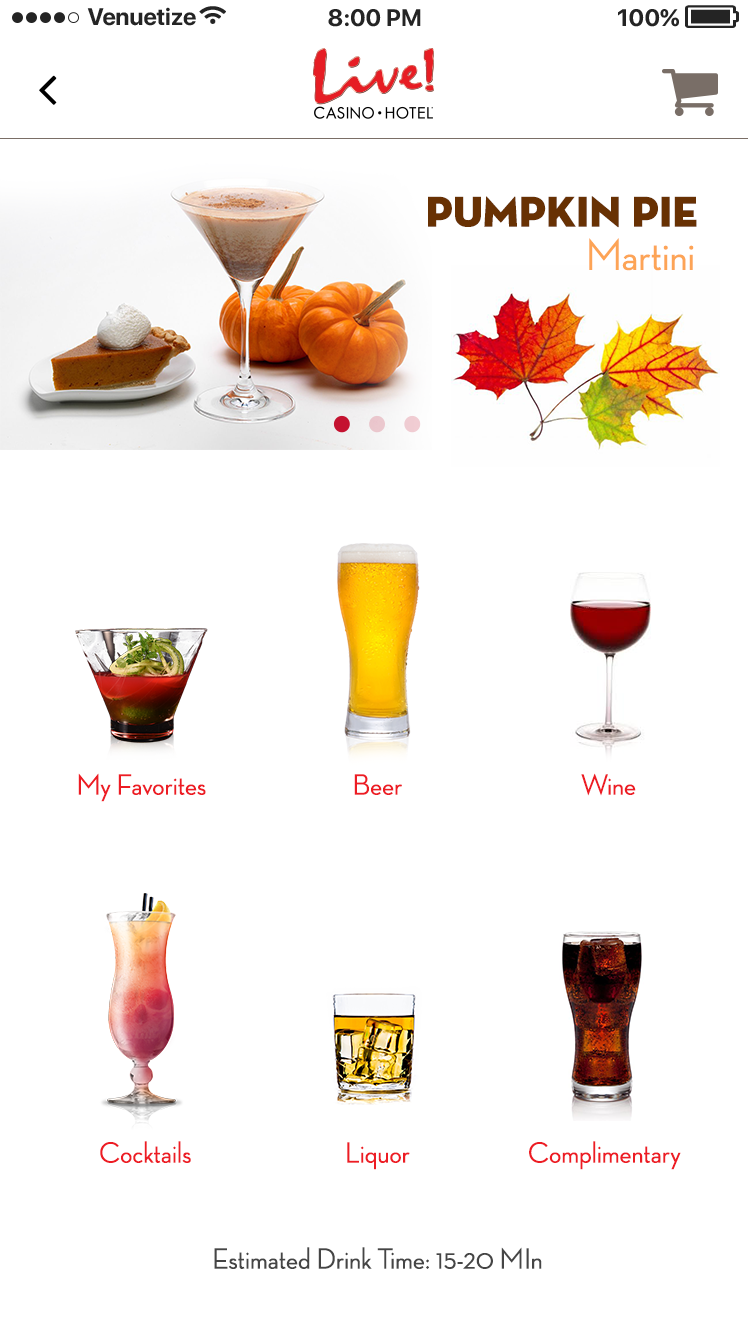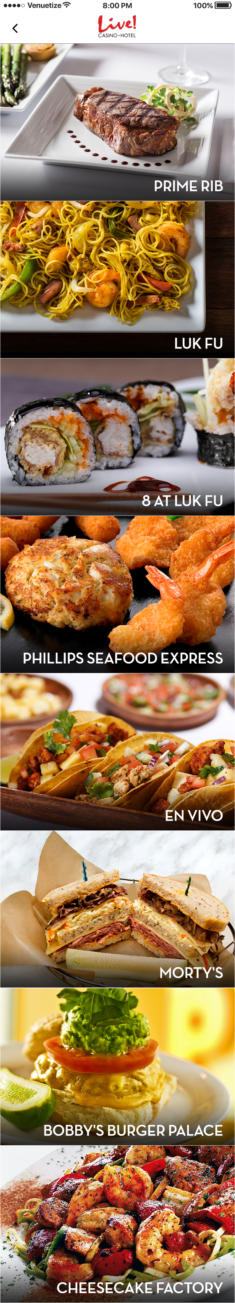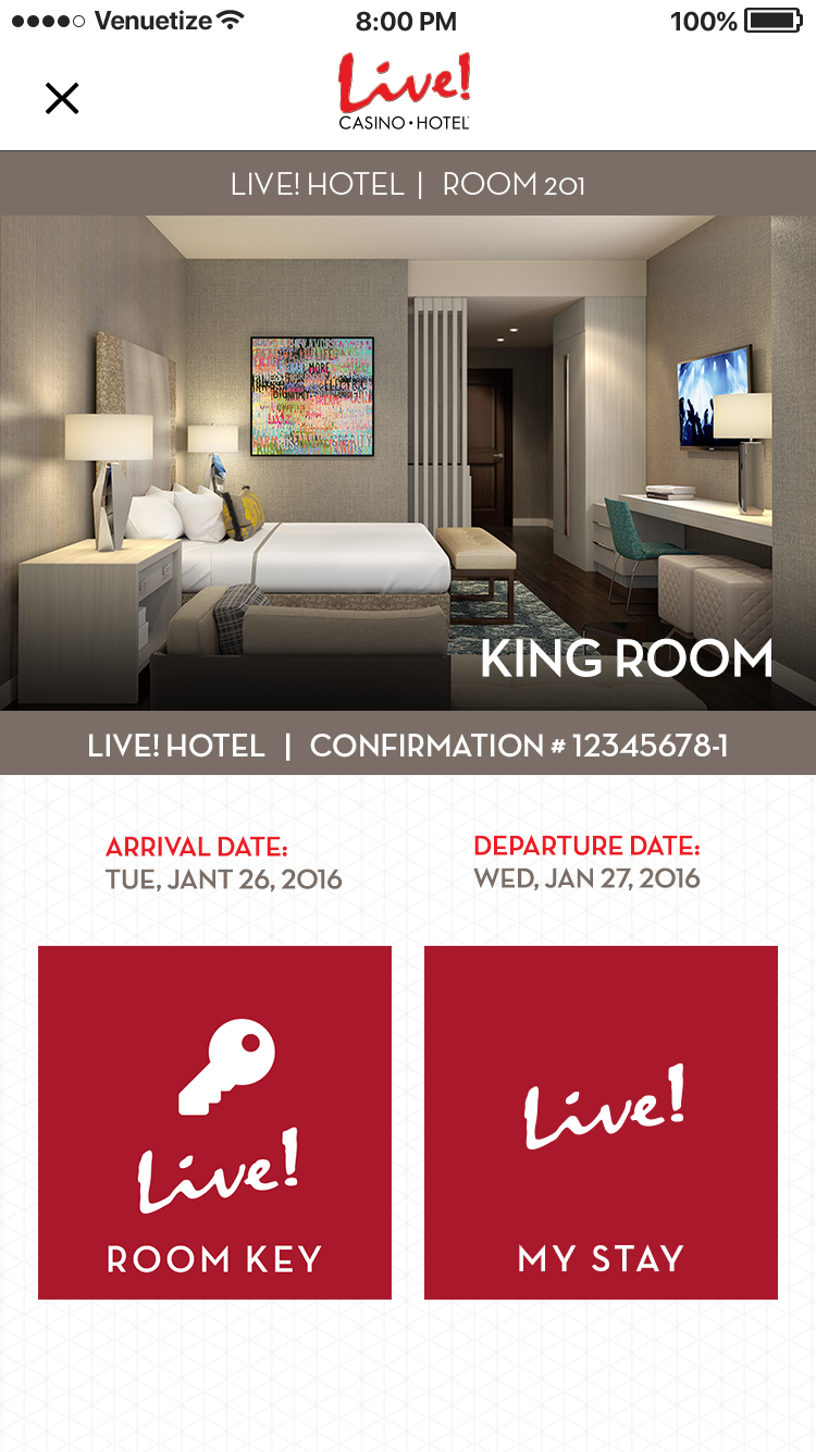 This app was designed for the Baltimore area casino Maryland Live. The goal was to alleviate tension points by allowing users to navigate the casino, reset pins in their account, book hotel rooms, use their phone as a hotel key, view rewards, and have in seat ordering. There was also a watch version for the wait staff to allow them to respond to and fulfill orders, and notify them where the guest is sitting in the casino.