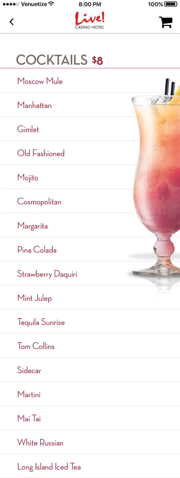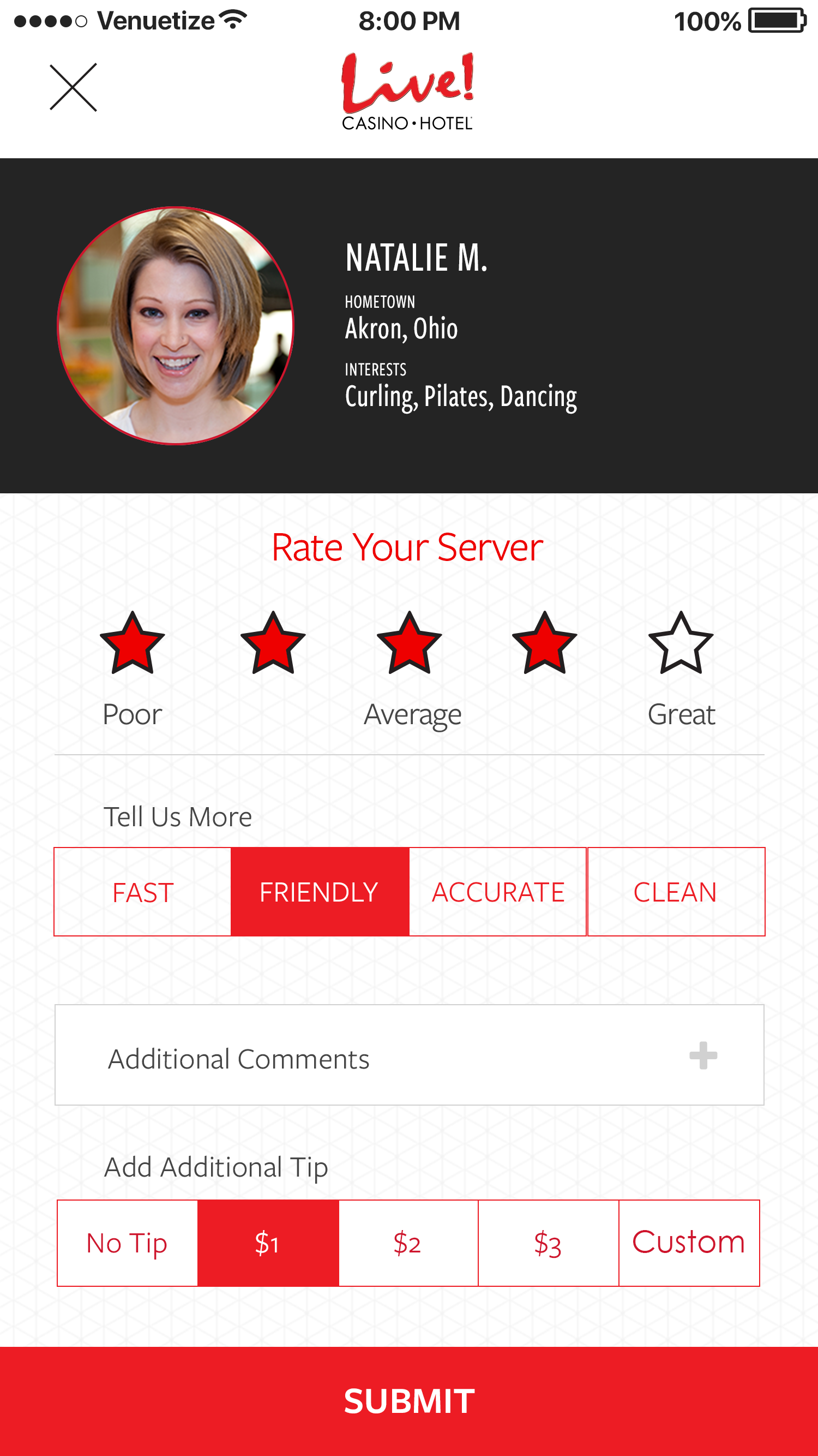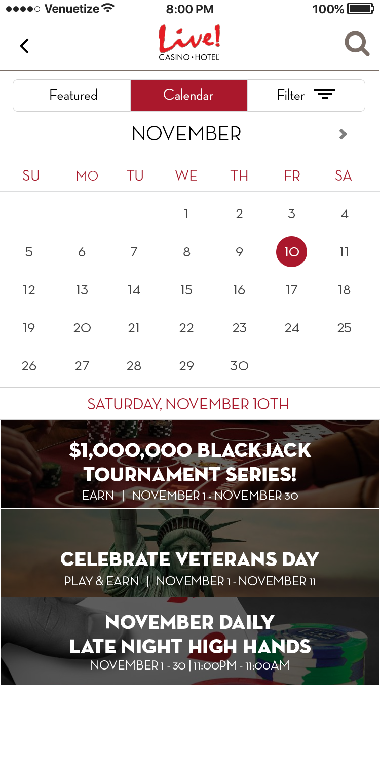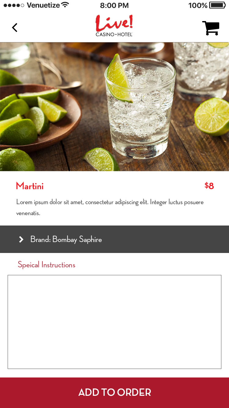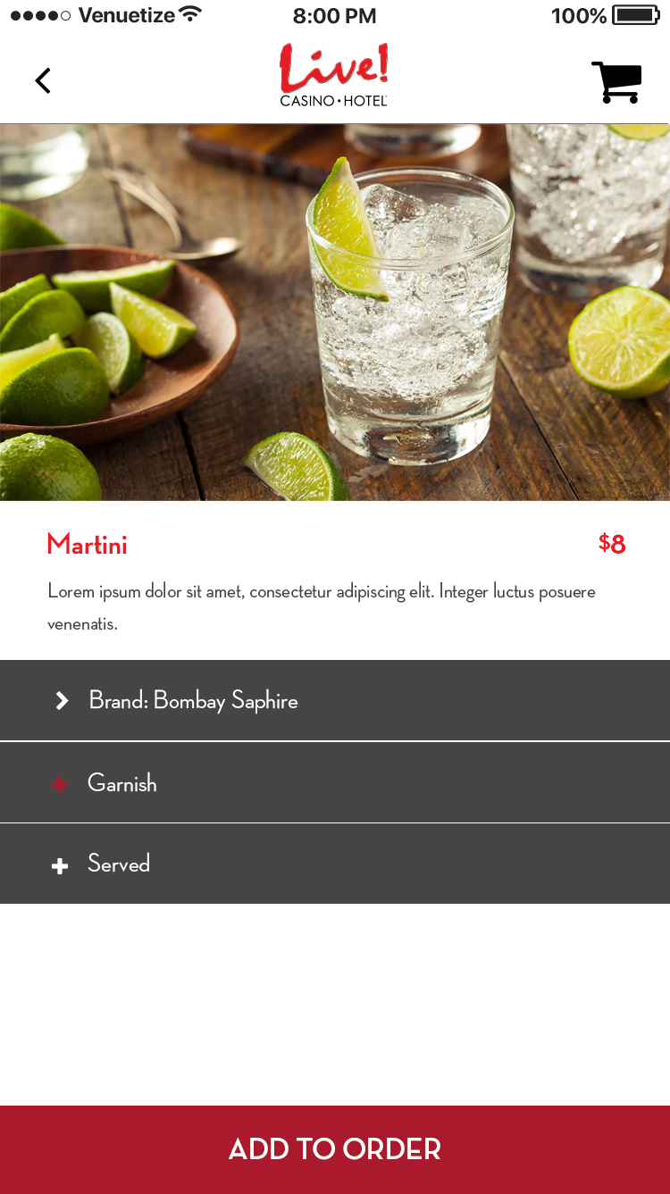 This app was designed for the Baltimore area casino Maryland Live. The goal was to alleviate tension points by allowing users to navigate the casino, reset pins in their account, book hotel rooms, use their phone as a hotel key, view rewards, and have in seat ordering. There was also a watch version for the wait staff to allow them to respond to and fulfill orders, and notify them where the guest is sitting in the casino.